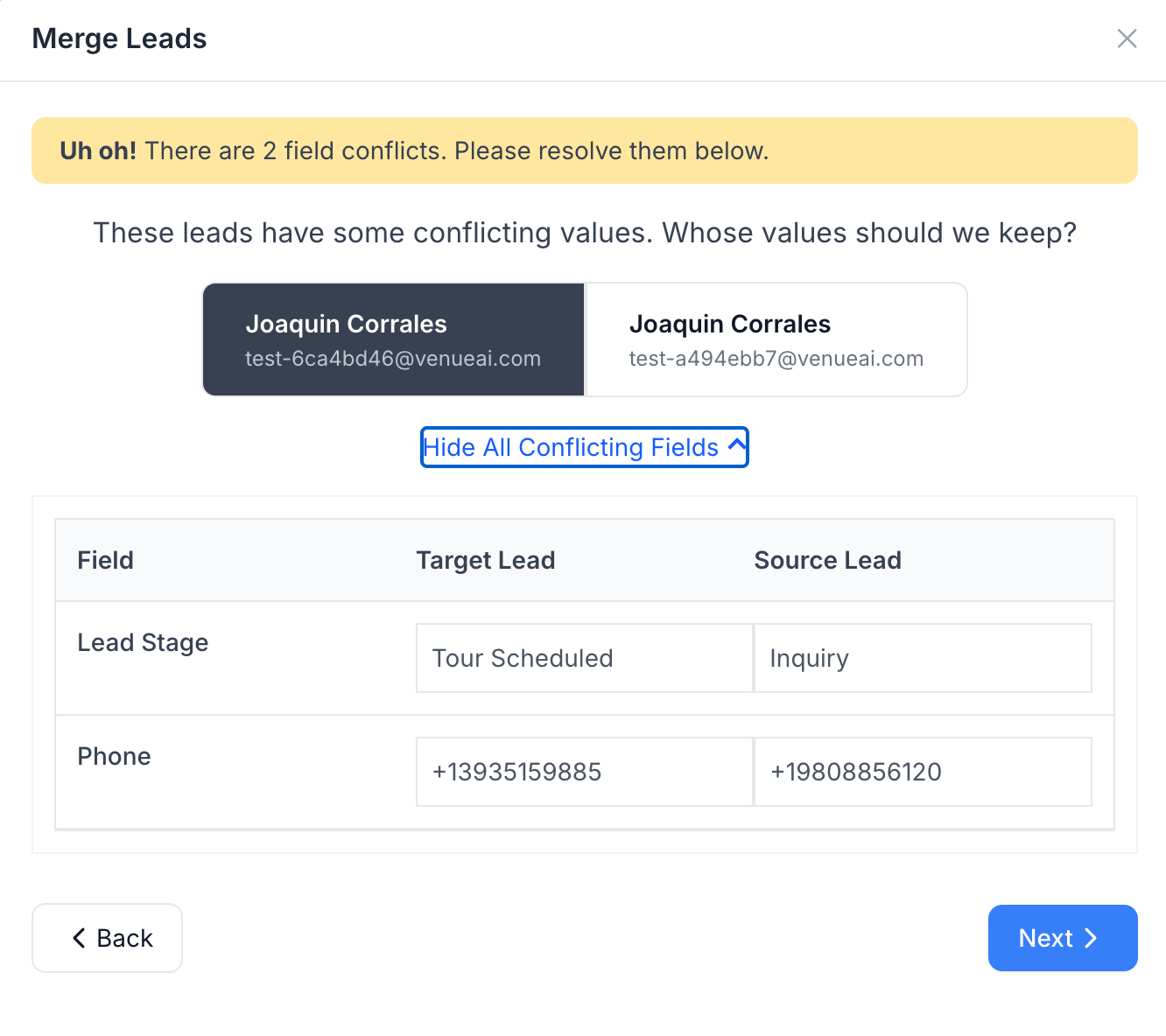 - If there are conflicting fields, you will be able to see them and select which leads fields you would like to keep in the merged lead. You can click on the left lead or the right lead to select which fields will be kept.