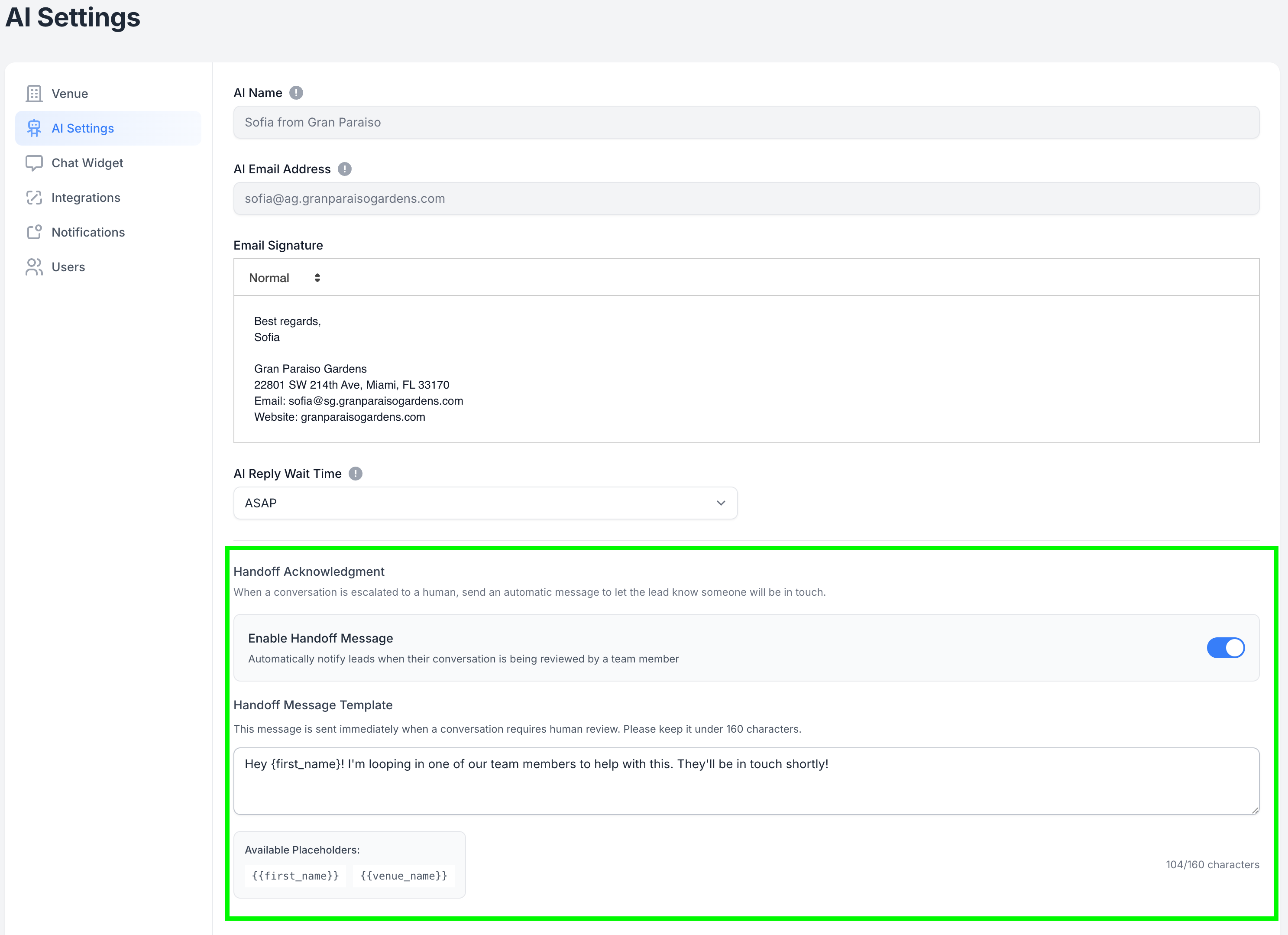 When a conversation gets escalated to your team, VenueAI now gives you the option to automatically send a quick message letting the lead know someone will follow up.