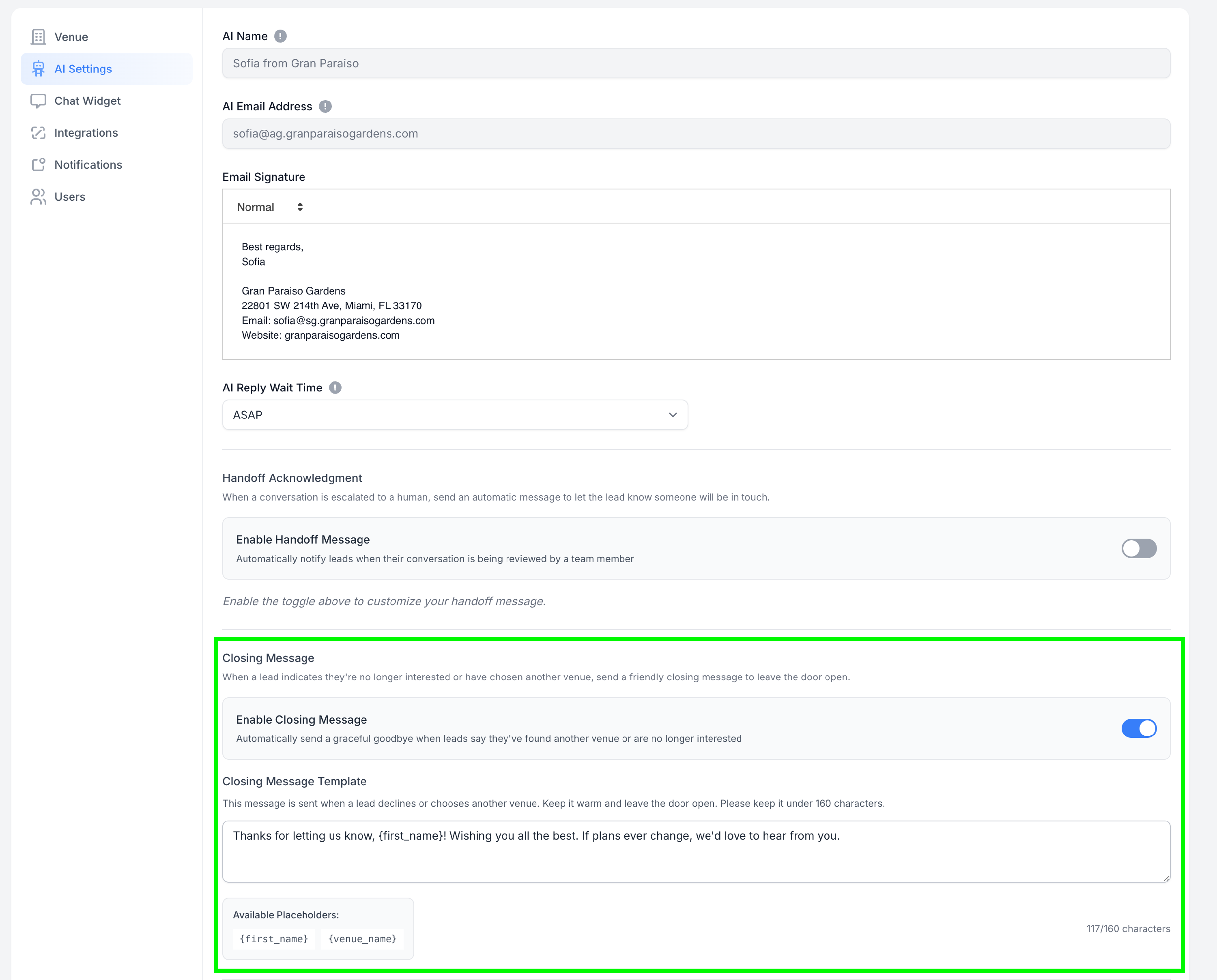 When a lead says they've found another venue or are no longer interested, VenueAI now gives you the option to automatically send a graceful goodbye, keeping the door open if plans change.