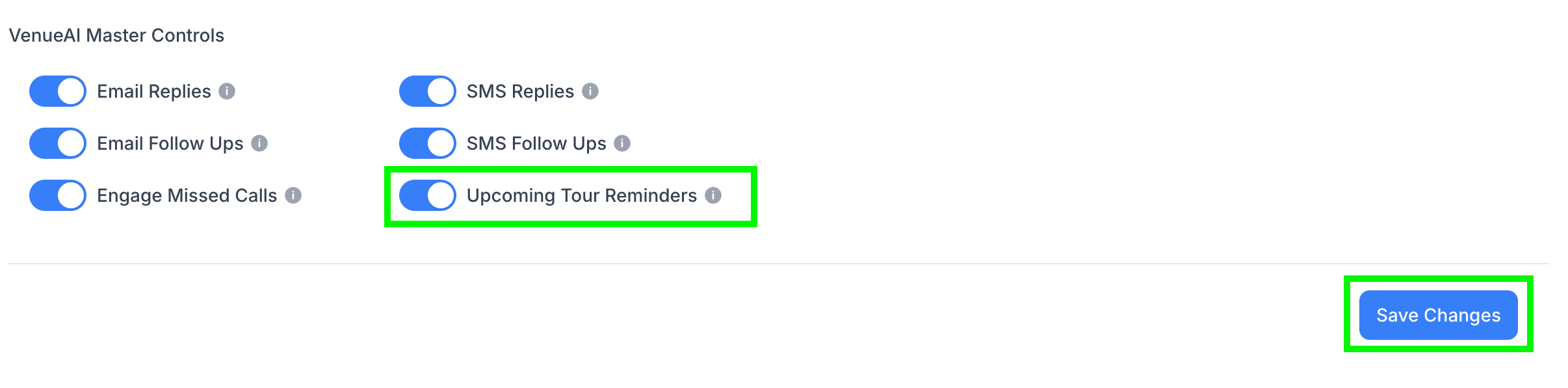 Head to Settings → AI Controls, scroll all the way down and toggle on "Upcoming Tour Reminders" + Save Changes.